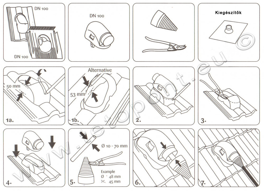A Szolárkivezető alkalmas a 20-70 mm átmérőjű kábelek és csövek átvezetésére, és kombinálható a legkülönbözőbb műanyag alapcserepekkel, különböző színekben.